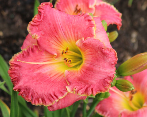 Clear coral pink with a pale watermark and bright yellow ruffled edge.