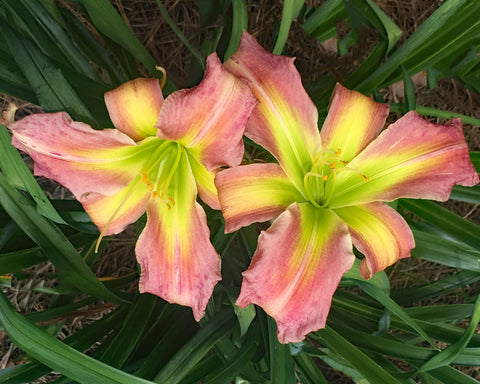 Coral pink daylily with a peach halo and extra large apple green throat.