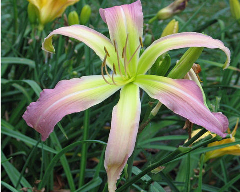 Serene clear lavender pink cascading unusual form with a large green throat. Awards: HM 2018.