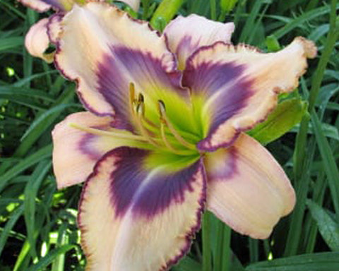 Cream with peach overlay and purple eye and edge above large yellow to green throat.