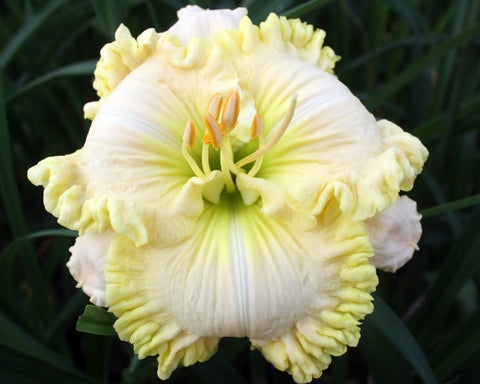 Superb, heavily ruffled icy pale yellow lavender flower. The substantial petal edges have gold bubbles, ruffles and 'owl ears' that extend into a green throat. Awards: AM 2011; HM 2008.